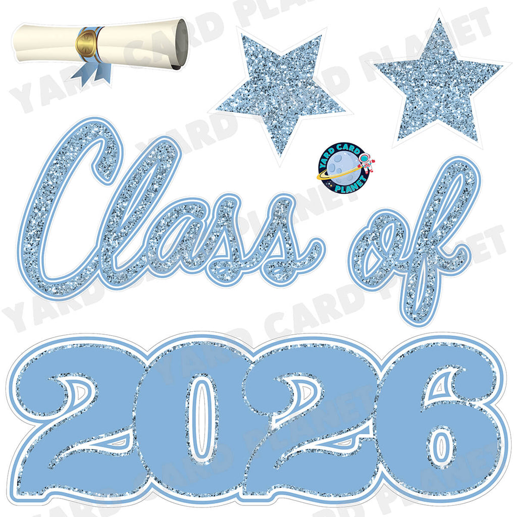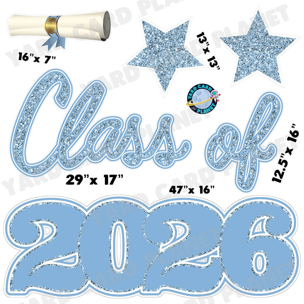 Say it loud and proud this graduation season with our bold Baby Blue Glitter Pattern Class of 2026 EZ Quick Set Half Sheet Yard Card Flair Set. It's great for combining with any student's name in their school colors. Save time setting up since our yard signs are conveniently connected in 3 EZ sets spelling out "CLASS OF 2026". No need to stake individual letters anymore, instead it's as simple as staking 3 large signs. You will also receive matching flair pieces. You will receive 6 lawn signs, professionally printed, precision cut and ready to stake in various sizes shown below.