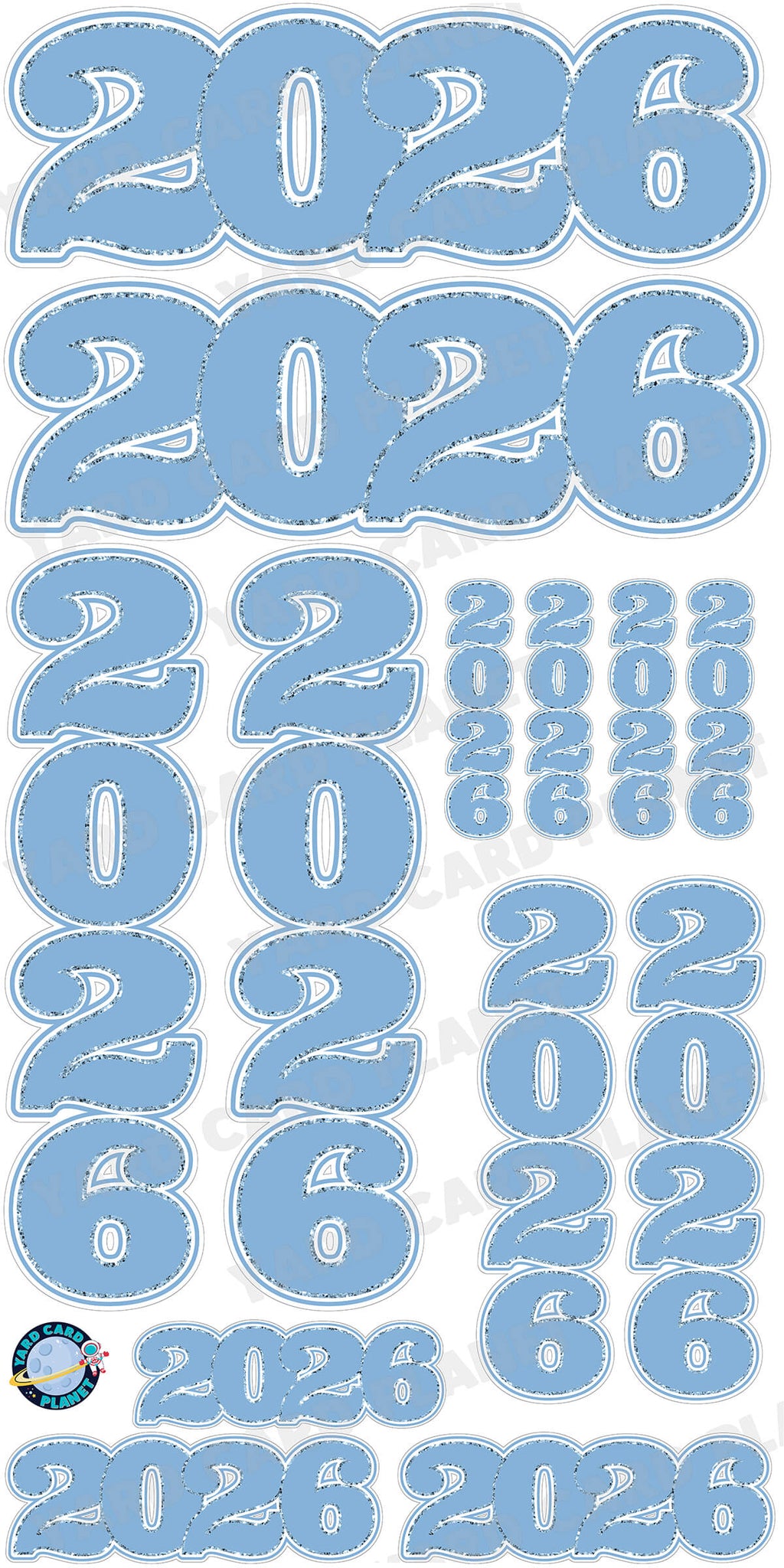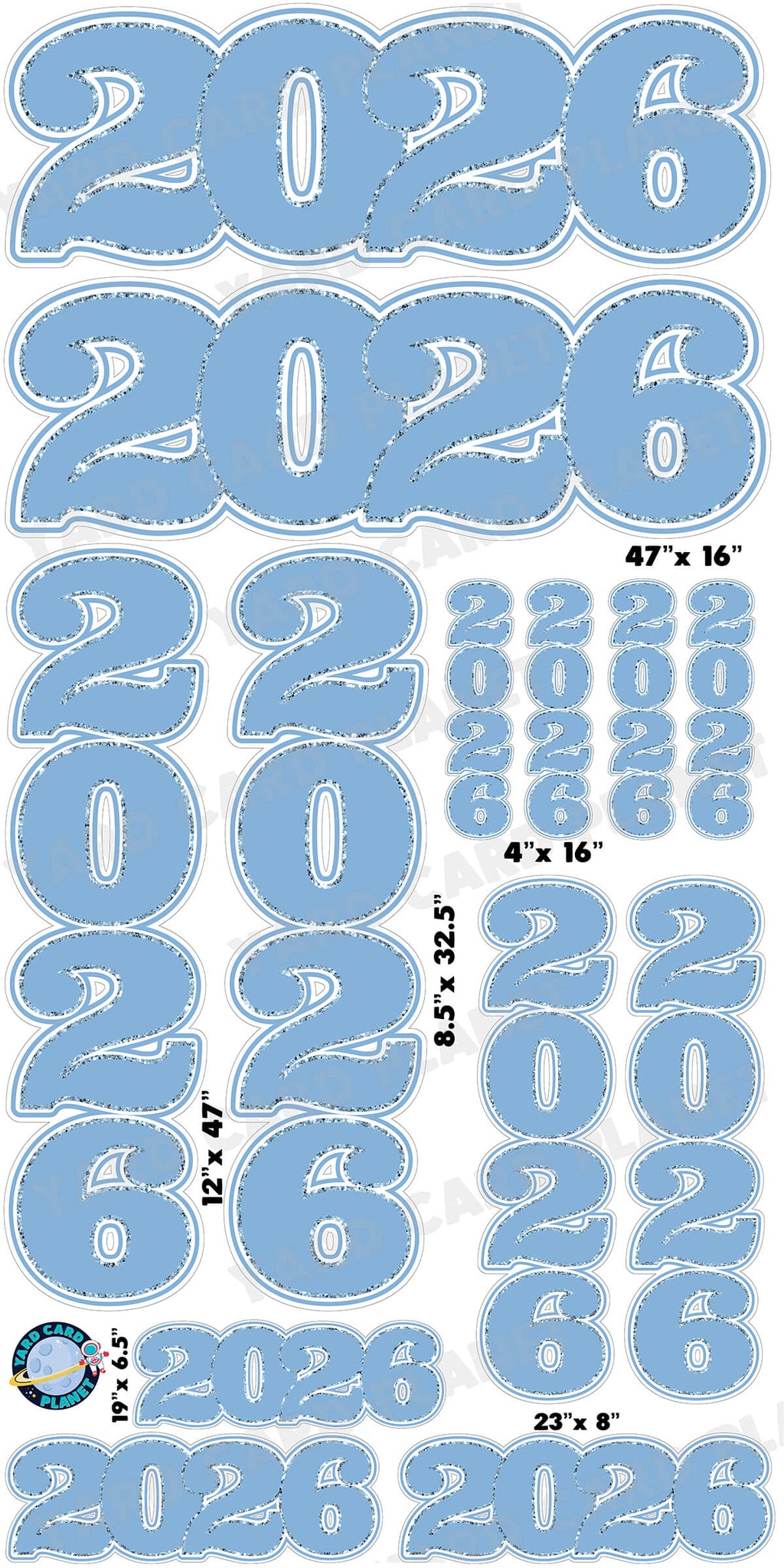 The year 2026 will be a special memory for all graduates this graduation season. Fill up your graduation yard card setups with our awesome Baby Blue Solid with Glitter Pattern Trim 2026 EZ Quick Signs and Towers Yard Card Set. These are great for combining with other fun graduation yard card pieces as well as your student's name in their school colors for your graduation lawn signs display. You will receive 13 lawn signs, professionally printed, precision cut and ready to stake in various sizes shown below.