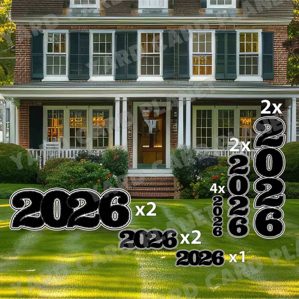 The year 2026 will be a special memory for all graduates this graduation season. Fill up your graduation yard card setups with our awesome Black Solid with Glitter Pattern Trim 2026 EZ Quick Signs and Towers Yard Card Set. These are great for combining with other fun graduation yard card pieces as well as your student's name in their school colors for your graduation lawn signs display. You will receive 13 lawn signs, professionally printed, precision cut and ready to stake in various sizes shown below.