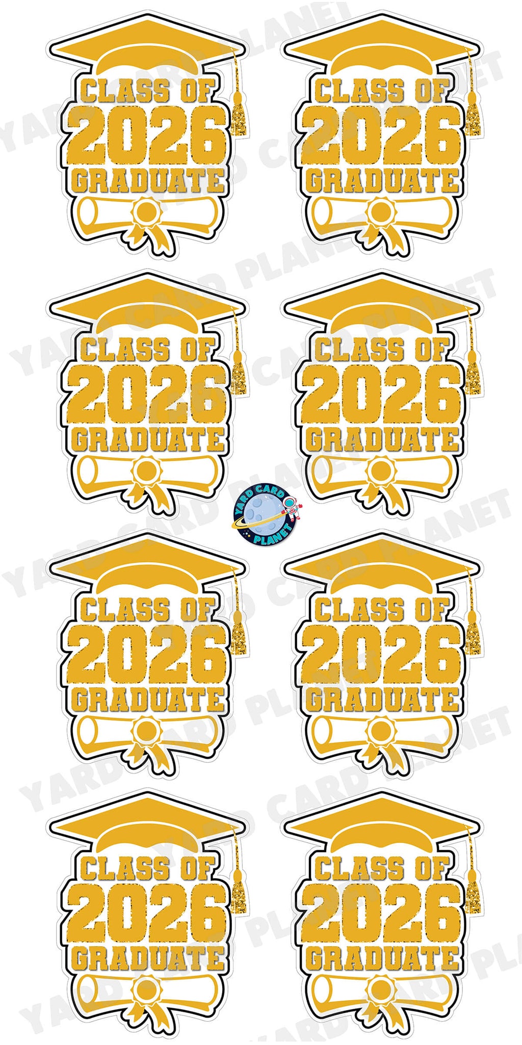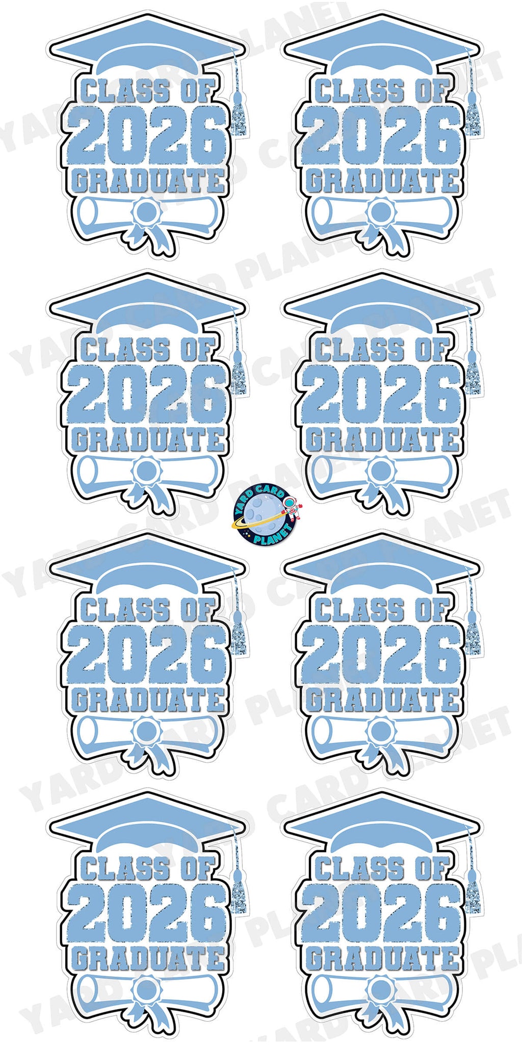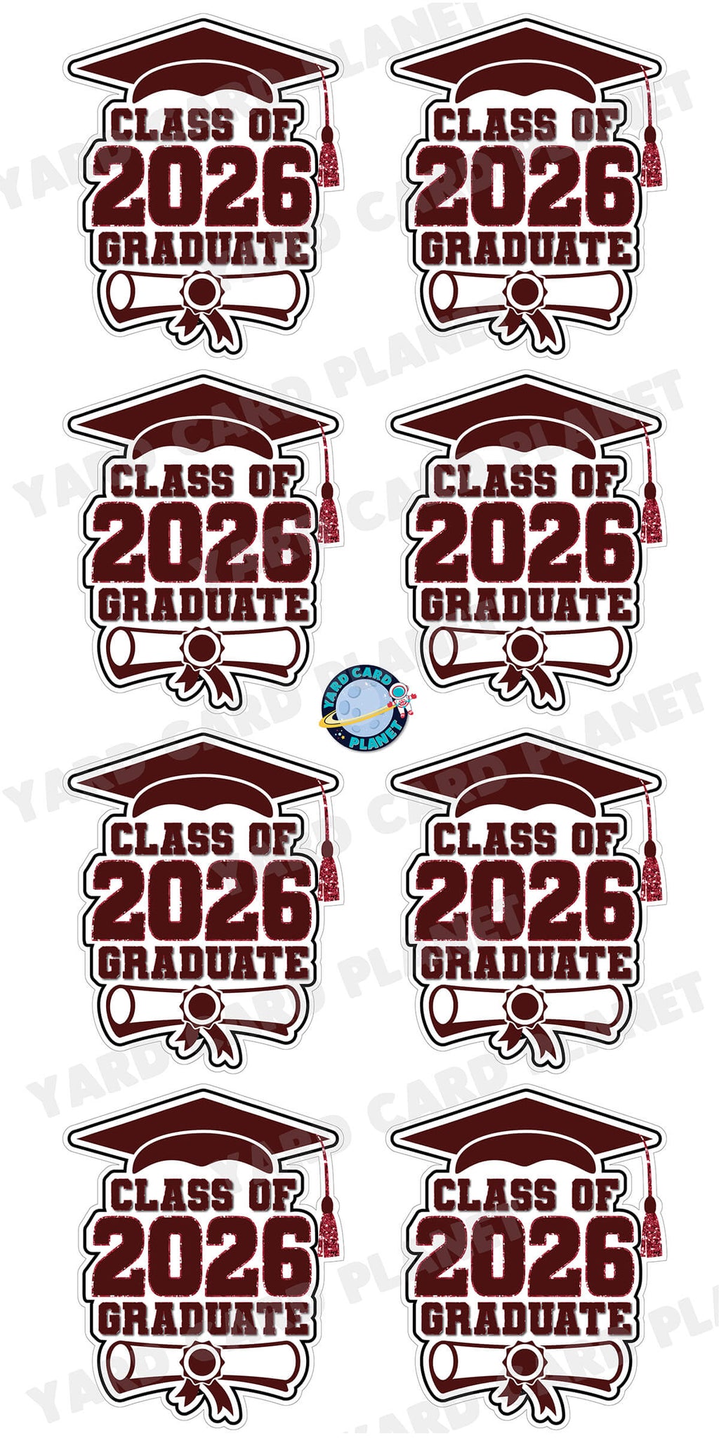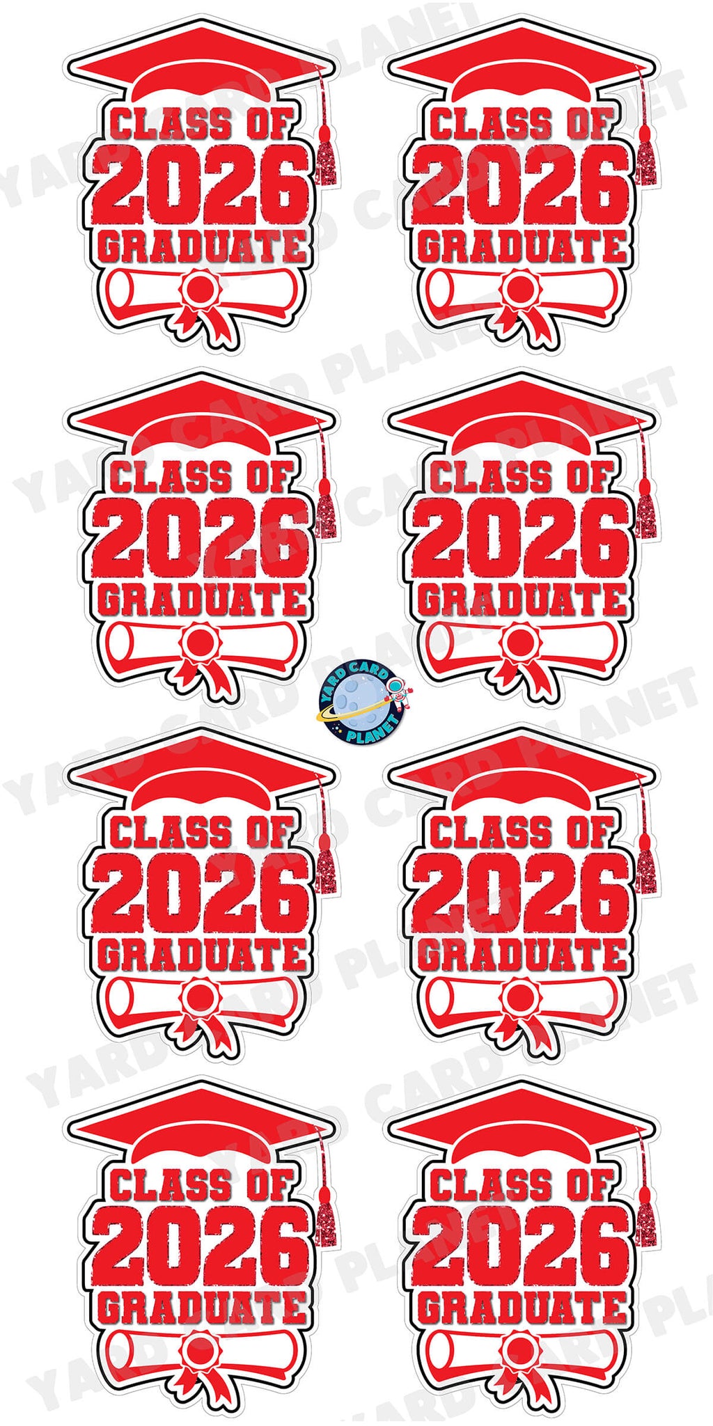 Celebrate the Class of 2026 in a bold and unforgettable way with our Class of 2026 Graduate Yard Card Sign Keepsakes in Solid Colors with Glitter Accent - (Available in Multiple Colors). Perfect for high school and college seniors, this standout keepsake features a classic graduation cap, scroll, and bold "Class of 2026 Graduate" lettering. These keepsake yard signs are ideal for honoring graduates in sports teams, clubs, academic programs, and more, plus they make a fantastic gift for students to proudly display at home or during senior celebrations. Whether you're a school administrator, PTA member, or a proud parent, this keepsake is a memorable way to celebrate your grads in style. You will receive 8 lawn signs, professionally printed, precision cut and ready to stake in various sizes shown below.