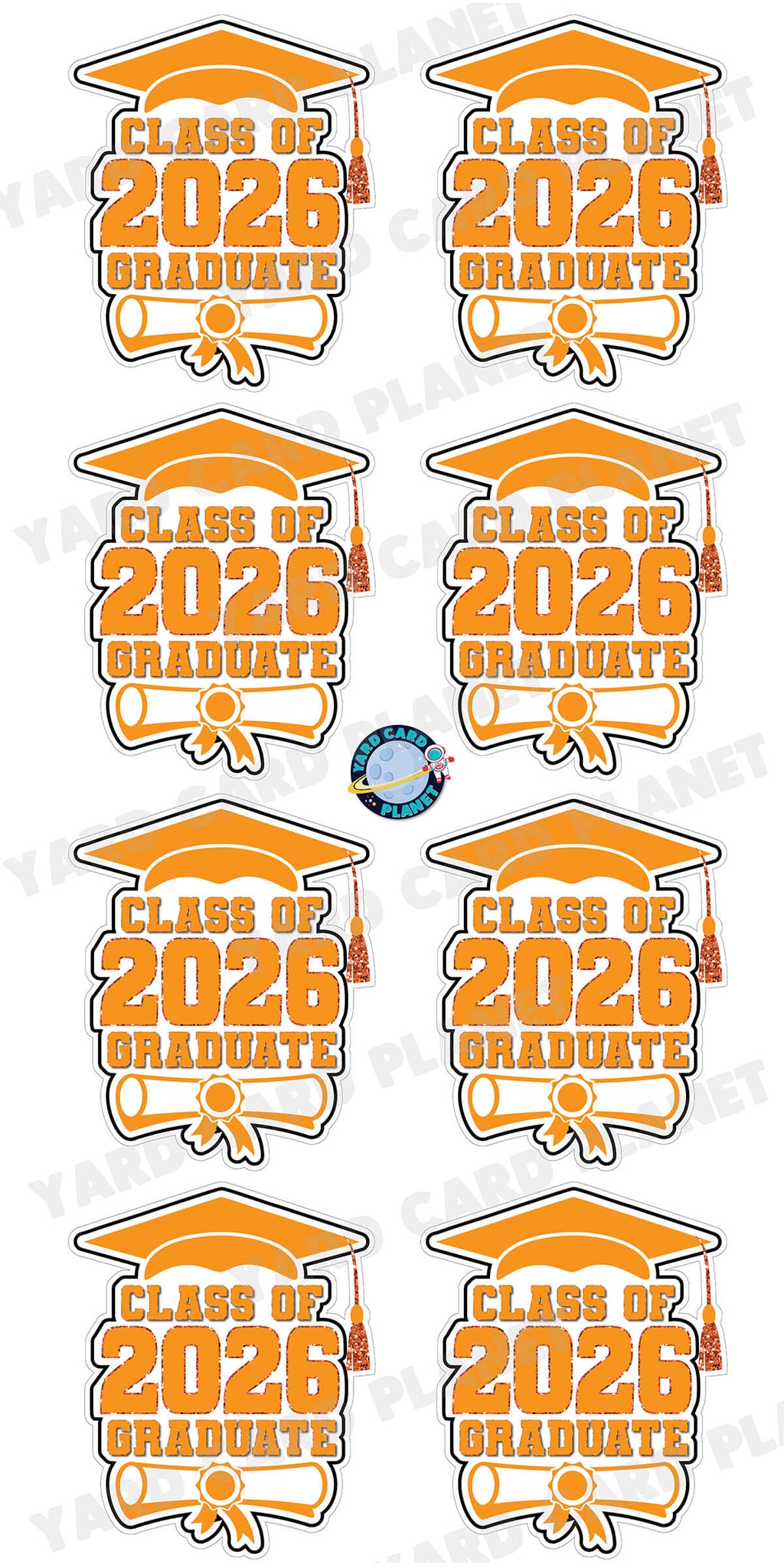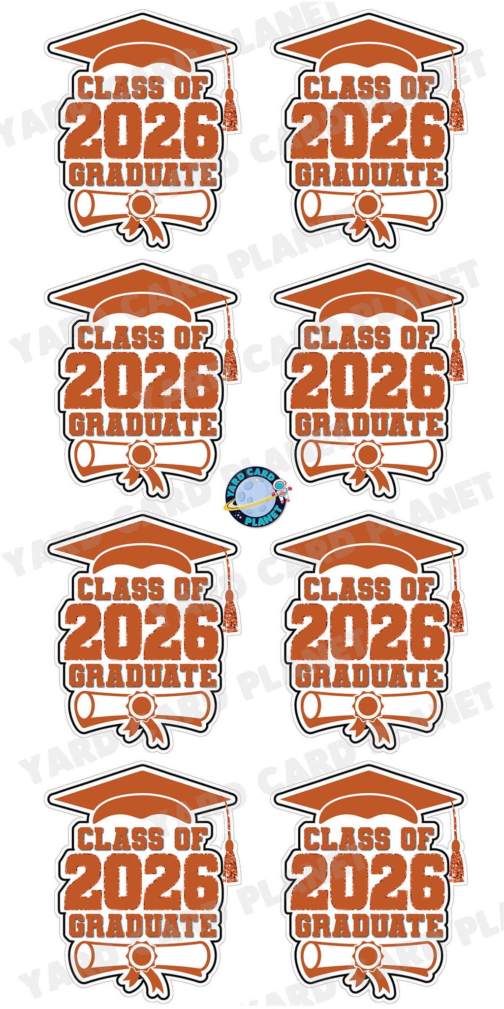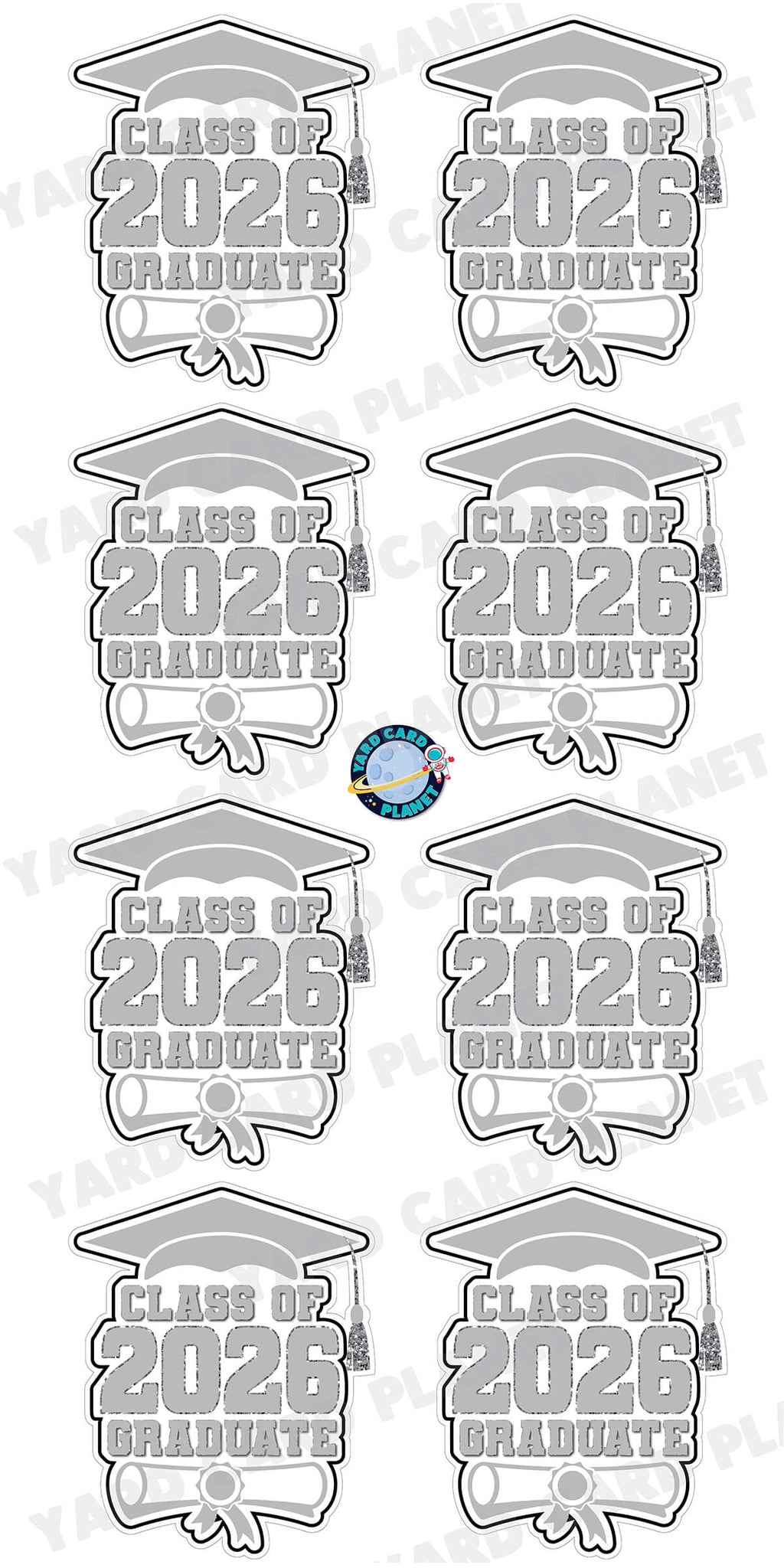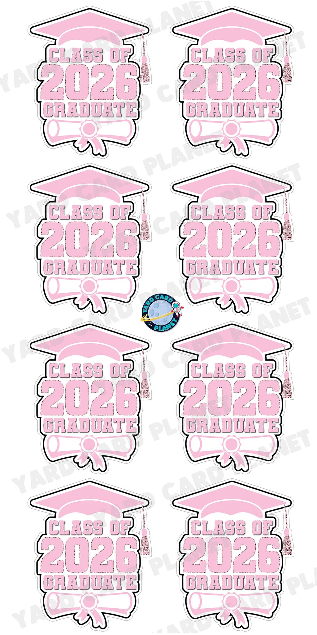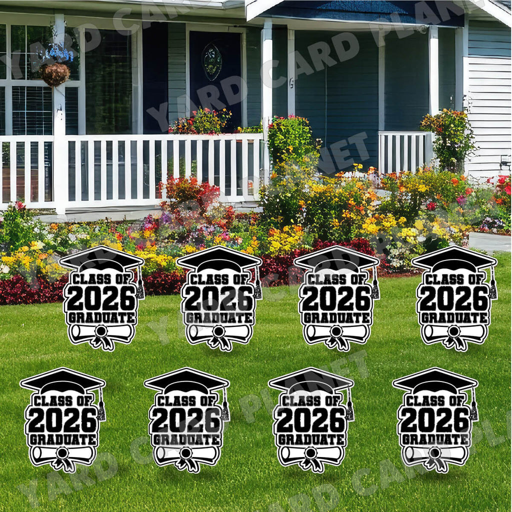 Celebrate the Class of 2026 in a bold and unforgettable way with our Class of 2026 Graduate Yard Card Sign Keepsakes in Solid Colors with Glitter Accent - (Available in Multiple Colors). Perfect for high school and college seniors, this standout keepsake features a classic graduation cap, scroll, and bold "Class of 2026 Graduate" lettering. These keepsake yard signs are ideal for honoring graduates in sports teams, clubs, academic programs, and more, plus they make a fantastic gift for students to proudly display at home or during senior celebrations. Whether you're a school administrator, PTA member, or a proud parent, this keepsake is a memorable way to celebrate your grads in style. You will receive 8 lawn signs, professionally printed, precision cut and ready to stake in various sizes shown below.