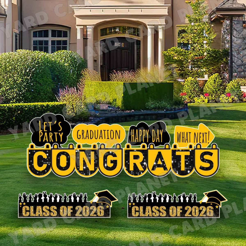 Fill in those hard to reach empty spaces of your next lawn sign setup with our ingeniously designed Congrats Graduation in Gold EZ Setup Panels and Signs Yard Card Set. These extra large borders and panels will help hide your stakes from showing while adding some pizzazz to your finished yard card display. No need to stake individual pieces anymore to fill in those gaps, instead it's as simple as staking 1 large sign. Matching graduation signs will also be included in this set. You will receive 8 lawn signs, professionally printed, precision cut and ready to stake in various sizes shown below.
