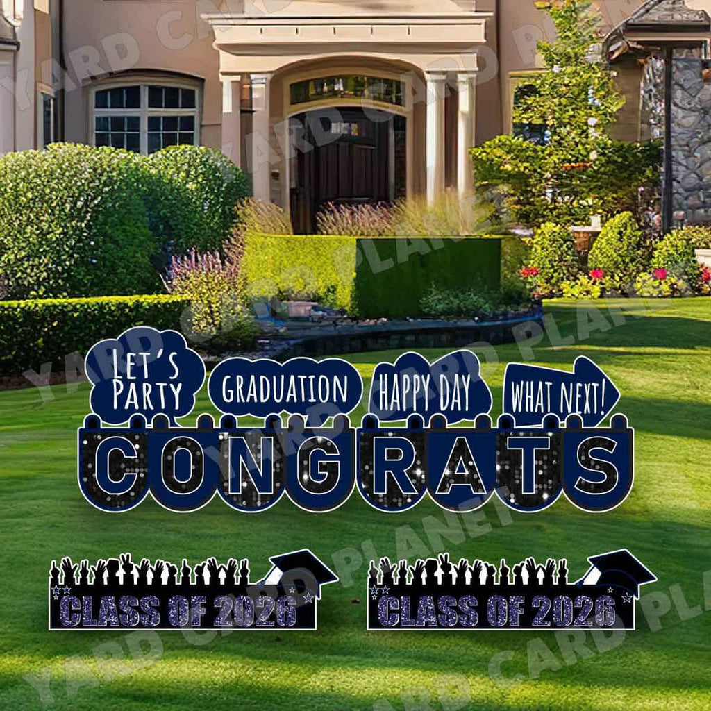 Fill in those hard to reach empty spaces of your next lawn sign setup with our ingeniously designed Congrats Graduation in Navy Blue EZ Setup Panels and Signs Yard Card Set. These extra large borders and panels will help hide your stakes from showing while adding some pizzazz to your finished yard card display. No need to stake individual pieces anymore to fill in those gaps, instead it's as simple as staking 1 large sign. Matching graduation signs will also be included in this set. You will receive 8 lawn signs, professionally printed, precision cut and ready to stake in various sizes shown below.