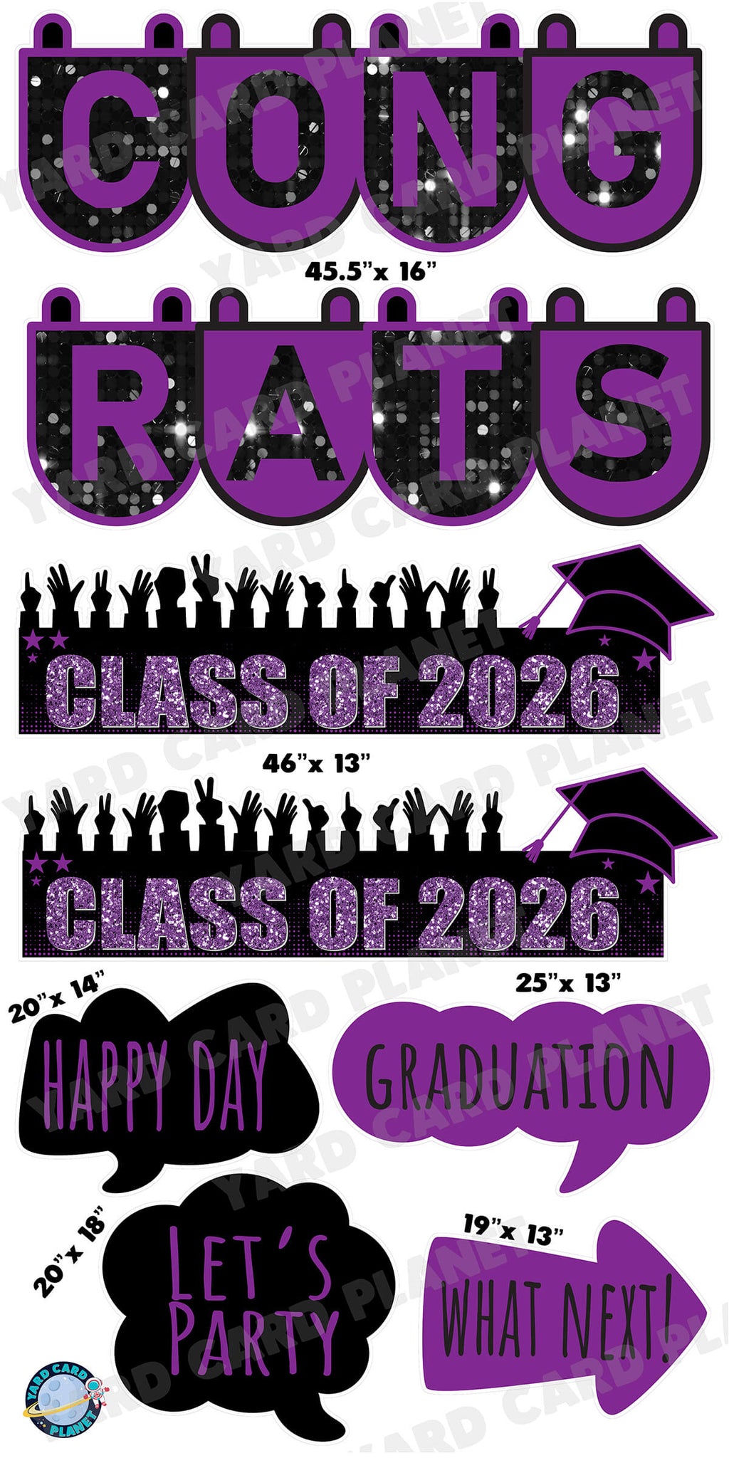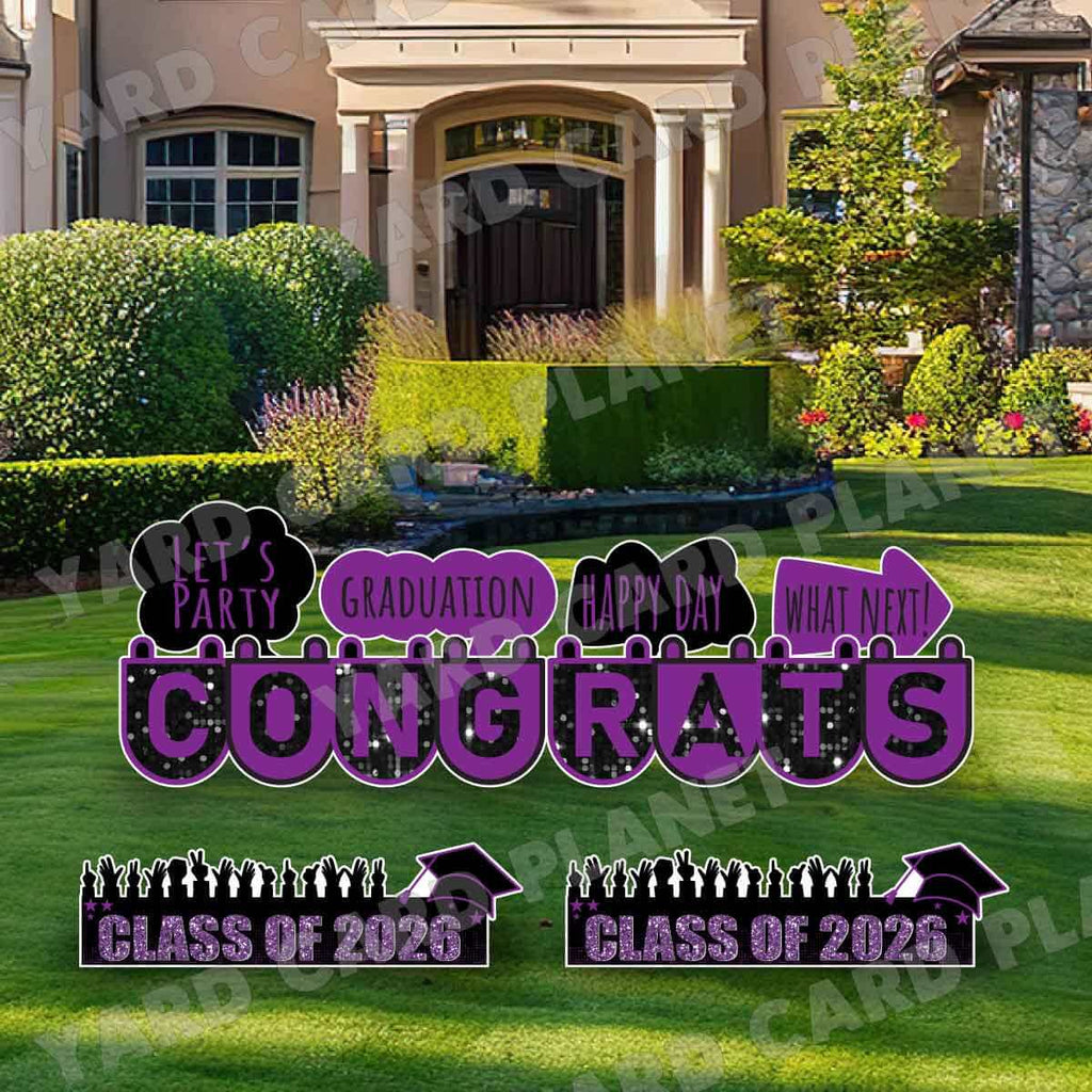 Fill in those hard to reach empty spaces of your next lawn sign setup with our ingeniously designed Congrats Graduation in Purple EZ Setup Panels and Signs Yard Card Set. These extra large borders and panels will help hide your stakes from showing while adding some pizzazz to your finished yard card display. No need to stake individual pieces anymore to fill in those gaps, instead it's as simple as staking 1 large sign. Matching graduation signs will also be included in this set. You will receive 8 lawn signs, professionally printed, precision cut and ready to stake in various sizes shown below.