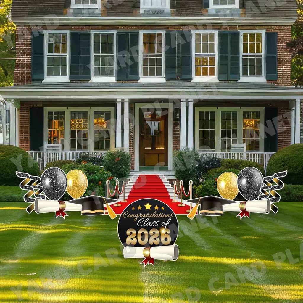 Celebrate your recent graduate in style with our elegant Congratulations Graduate EZ Quick Sign and Red Carpet Yard Card Flair Set. You yard card display is sure to be the talk of the neighborhood. This set is a great compliment to any graduation yard sign display. Simply add a name, a greeting and other graduation flair pieces to your setup. You will receive 14 lawn signs, professionally printed, precision cut and ready to stake in various sizes shown below.