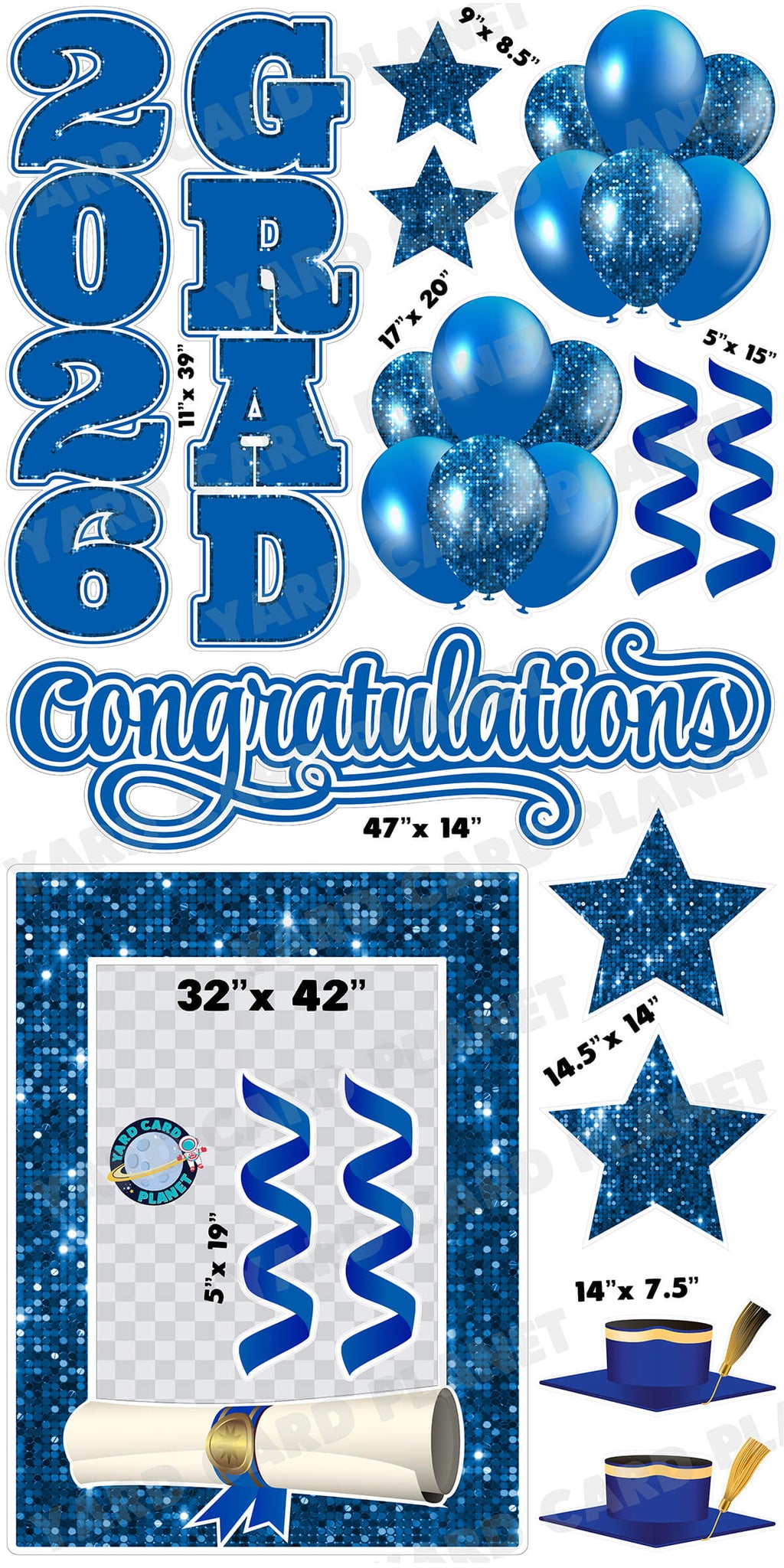 2026 is a huge year for all graduates so why not make it extra special with our amazing Blue Solid and Sequin Pattern 2026 EZ Quick Frame, EZ Quick Sign and Towers Yard Card Flair Set. This set has everything you need to celebrate your hard working graduate this graduation season. Have them pose with their yard card setup behind the EZ Quick Frame making a great memory for them and their family. Add your student's name and other fun graduation flair pieces to make it even more special. You will receive 16 lawn signs, professionally printed, precision cut and ready to stake in various sizes shown below.