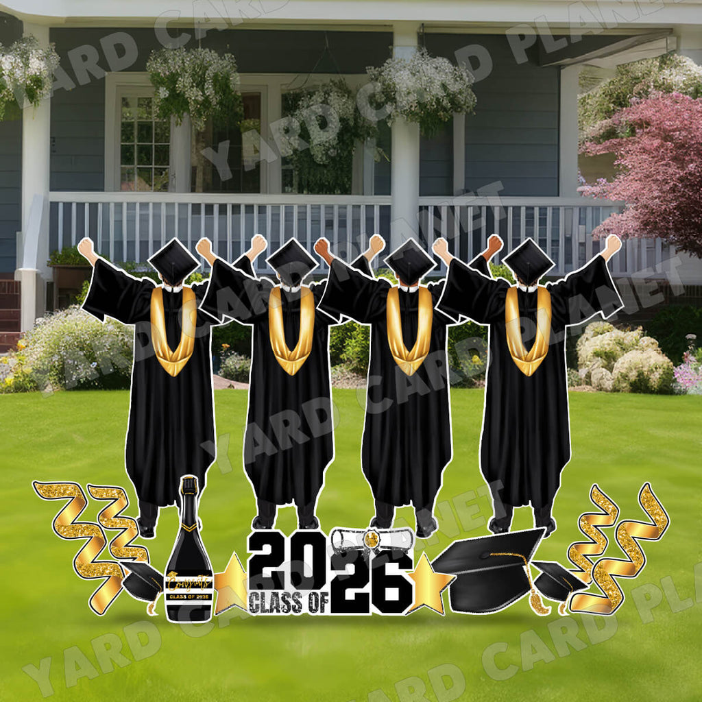 Stand proud and let's celebrate the graduation boy with our Elegant Graduation Boys, Grad Sign and Yard Card Flair Set. You yard card display is sure to be the talk of the neighborhood. This set is a great compliment to any graduation yard sign display. Simply add a name, a greeting and other graduation flair pieces to your setup. You will receive 15 lawn signs, professionally printed, precision cut and ready to stake in various sizes shown below.