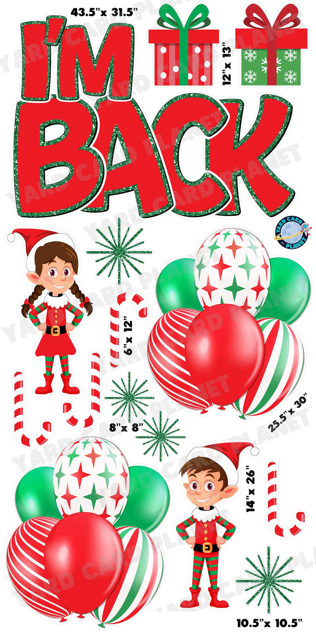 Kick off the holiday season with a display the kids will spot from down the street. Our Elf on the Shelf I'm Back EZ Quick Sign and Yard Card Flair Set gives you a bold, cheerful welcome scene the moment your elf returns for the year. This set makes a great addition to any lawn sign display and can easily be customized by adding other fun flair pieces as part of the yard card setup. You will receive 15 lawn signs, professionally printed, precision cut and ready to stake in various sizes shown below.