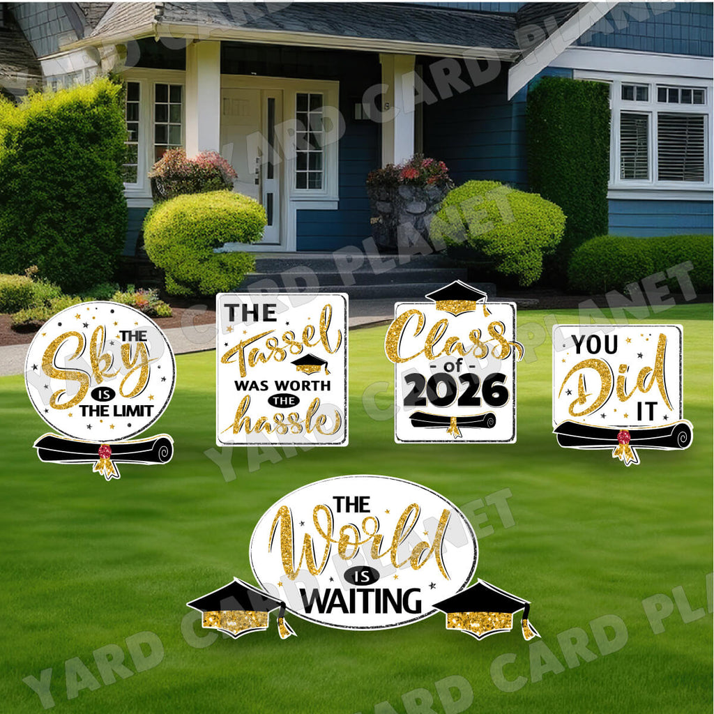 Get your recent graduate ready for their next stage in life with our awesome Glitter Pattern Graduation Sayings Signs and Yard Card Flair Set. This set is a great compliment to any graduation yard sign display. Simply add a name, a greeting and other graduation flair pieces to your setup. You will receive 9 lawn signs, professionally printed, precision cut and ready to stake in various sizes shown below.