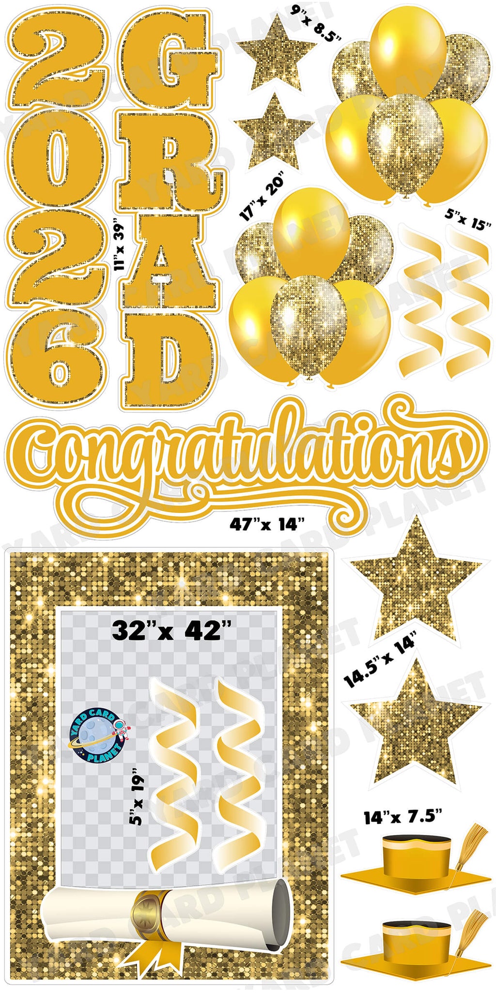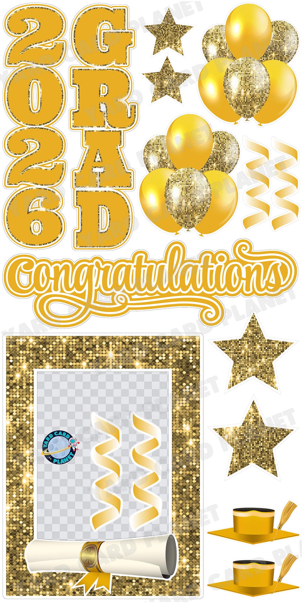 2026 is a huge year for all graduates so why not make it extra special with our amazing Gold Solid and Sequin Pattern 2026 EZ Quick Frame, EZ Quick Sign and Towers Yard Card Flair Set. This set has everything you need to celebrate your hard working graduate this graduation season. Have them pose with their yard card setup behind the EZ Quick Frame making a great memory for them and their family. Add your student's name and other fun graduation flair pieces to make it even more special. You will receive 16 lawn signs, professionally printed, precision cut and ready to stake in various sizes shown below.