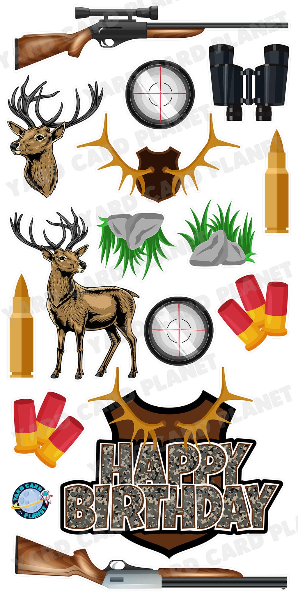 Celebrate your favorite hunter’s big day with the Happy Birthday Hunting EZ Quick Yard Card Set. This bold outdoor yard sign display captures the excitement of a day in the woods, complete with camo accents, trophy bucks, and rustic antlers that make the design stand tall. It’s the perfect setup for anyone who loves the outdoors, hunting season, or country-style celebrations. This amazing set is a great addition to any lawn sign display and can easily be customized by adding a name and other fun flair pieces as part of the yard card setup. You will receive 15 lawn signs, professionally printed, precision cut and ready to stake in various sizes shown below.