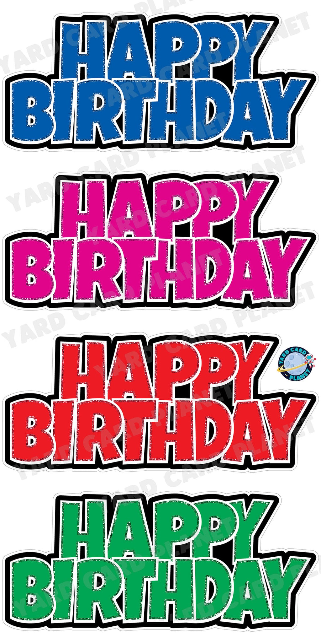 Celebrate birthdays in bold style with our Happy Birthday Luckiest Guy EZ Quick Signs! This lawn sign set includes four vibrant designs in Blue, Hot Pink, Red and Green, each accented with sparkling glitter pattern trim for an extra festive touch. Designed in the fun and playful Luckiest Guy font, these oversized signs are designed to stand out in any yard, making birthday greetings impossible to miss. Each of these EZ Quick Signs are a great centerpiece to any Birthday lawn sign display and can easily be customized by adding a name and fun flair pieces as part of the yard card setup. You will receive 4 extra large lawn signs, professionally printed, precision cut and ready to stake in various sizes shown below.