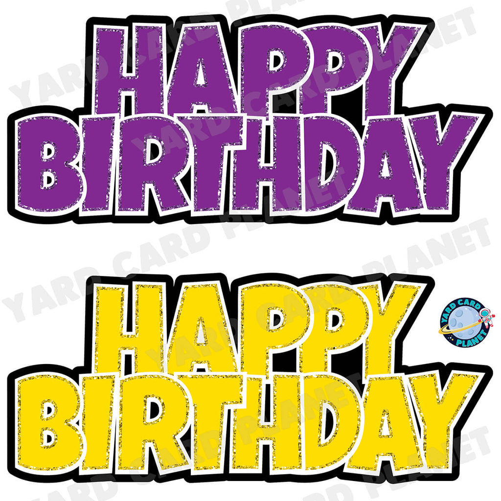 Celebrate birthdays in bold style with our Happy Birthday Luckiest Guy EZ Quick Signs Half Sheet! This lawn sign set includes two vibrant designs in Purple and Yellow, each accented with sparkling glitter pattern trim for an extra festive touch. Designed in the fun and playful Luckiest Guy font, these oversized signs are designed to stand out in any yard, making birthday greetings impossible to miss. Each of these EZ Quick Signs are a great centerpiece to any Birthday lawn sign display and can easily be customized by adding a name and fun flair pieces as part of the yard card setup. You will receive 2 extra large lawn signs, professionally printed, precision cut and ready to stake in various sizes shown below.