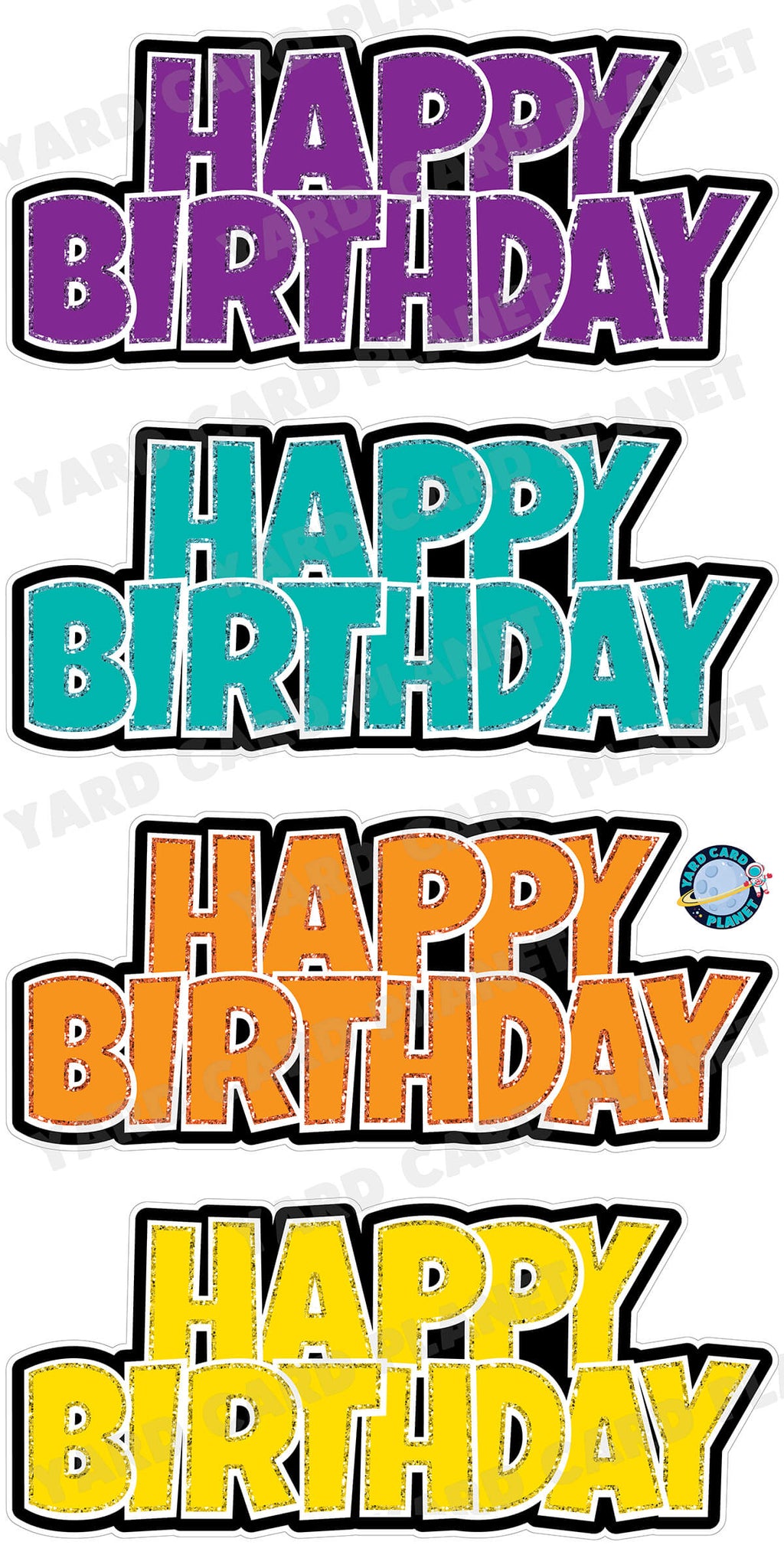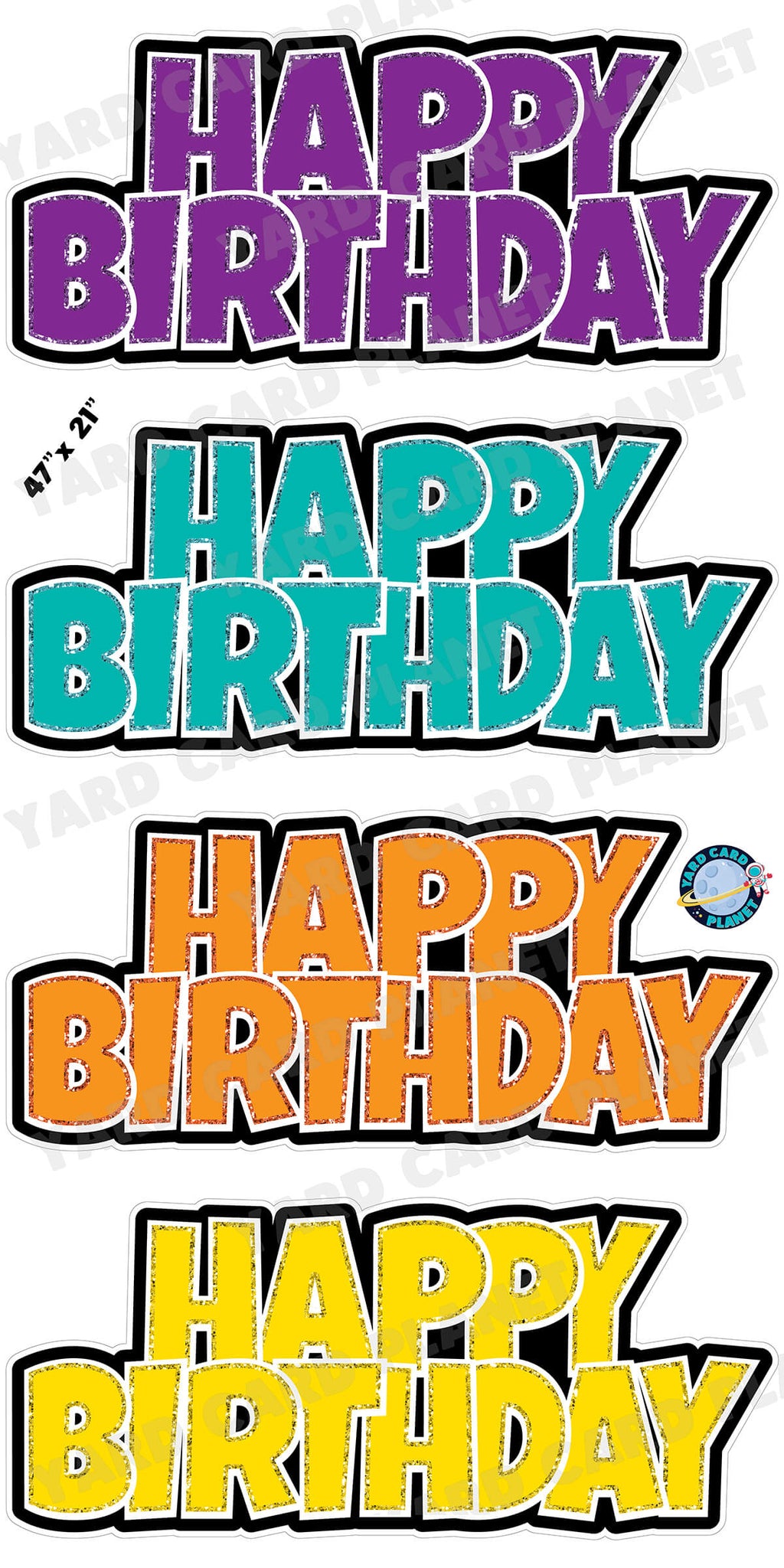 Celebrate birthdays in bold style with our Happy Birthday Luckiest Guy EZ Quick Signs! This lawn sign set includes four vibrant designs in Purple, Teal, Orange and Yellow, each accented with sparkling glitter pattern trim for an extra festive touch. Designed in the fun and playful Luckiest Guy font, these oversized signs are designed to stand out in any yard, making birthday greetings impossible to miss. Each of these EZ Quick Signs are a great centerpiece to any Birthday lawn sign display and can easily be customized by adding a name and fun flair pieces as part of the yard card setup. You will receive 4 extra large lawn signs, professionally printed, precision cut and ready to stake in various sizes shown below.