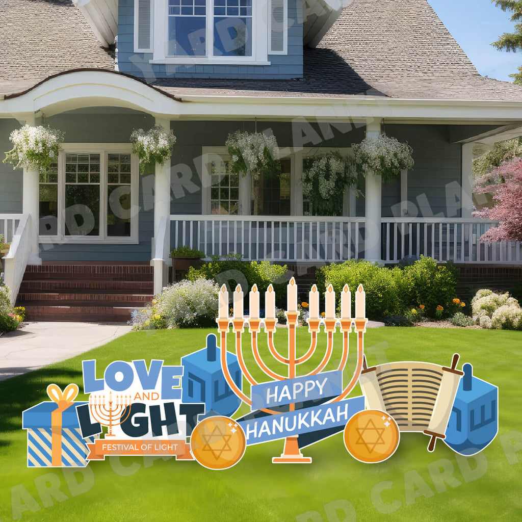 Wish everyone in the neighborhood a very Happy Hanukkah and spread Love and Light with our adorable Happy Hanukkah Love and Light Signs and Yard Card Flair Set. This set makes a great addition to any lawn sign display and can easily be customized by adding a name, a greeting and other holiday flair pieces as part of the yard card setup. You will receive 8 lawn signs, professionally printed, precision cut and ready to stake in various sizes shown below.