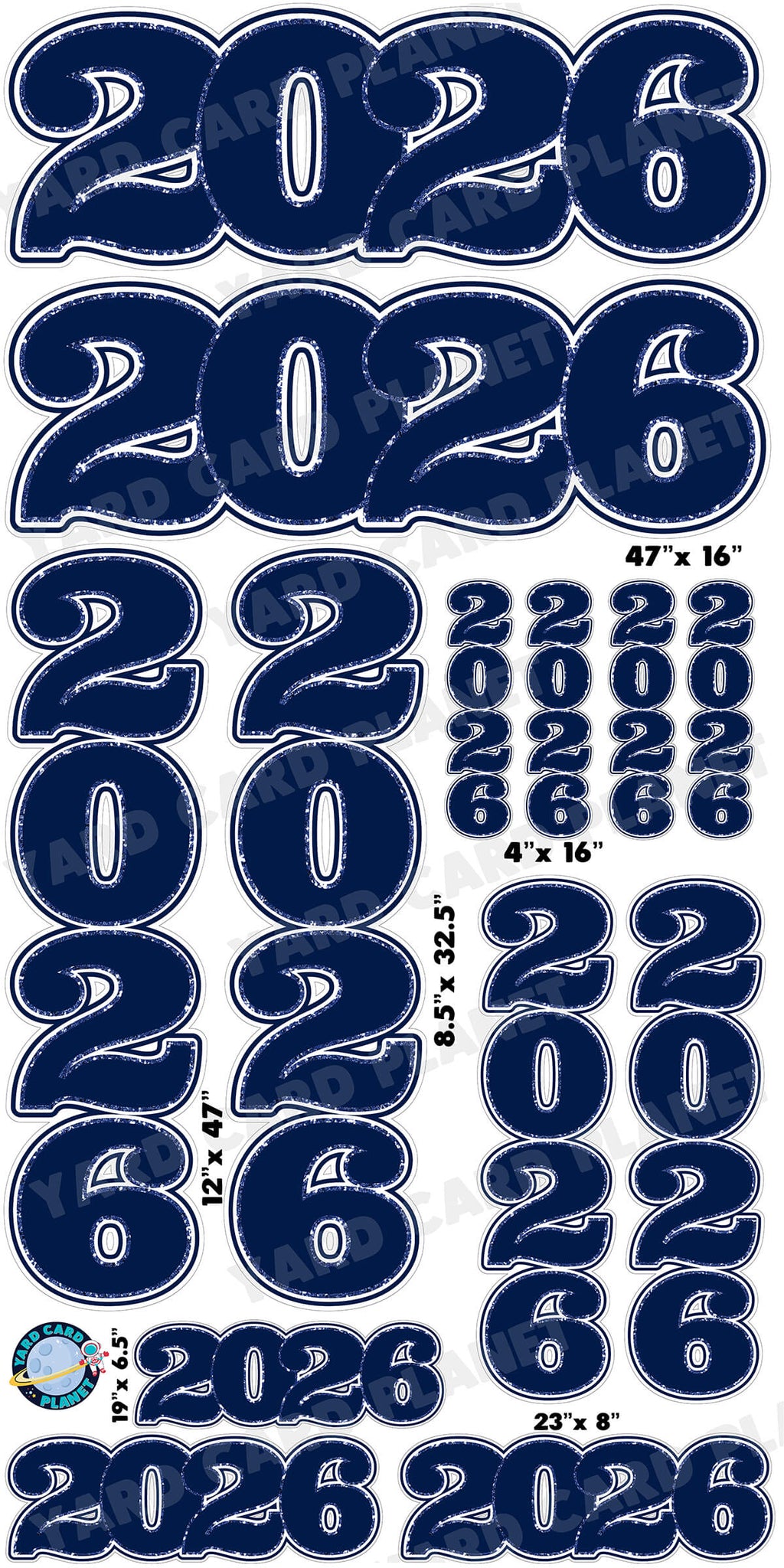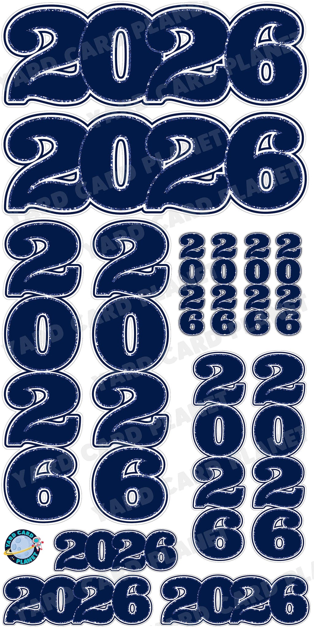The year 2026 will be a special memory for all graduates this graduation season. Fill up your graduation yard card setups with our awesome Navy Blue Solid with Glitter Pattern Trim 2026 EZ Quick Signs and Towers Yard Card Set. These are great for combining with other fun graduation yard card pieces as well as your student's name in their school colors for your graduation lawn signs display. You will receive 13 lawn signs, professionally printed, precision cut and ready to stake in various sizes shown below.
