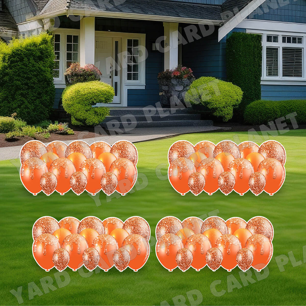 Fill in those hard to reach empty spaces of your next lawn sign setup with our ingeniously designed Orange Glitter Balloon Panels Yard Card Set. These extra large panels and borders will help hide your stakes from showing while adding some pizzazz to your finished yard card display. No need to stake individual pieces anymore to fill in those gaps, instead it's as simple as staking 1 large sign. You will receive 4 lawn signs, professionally printed, precision cut and ready to stake in various sizes shown below.