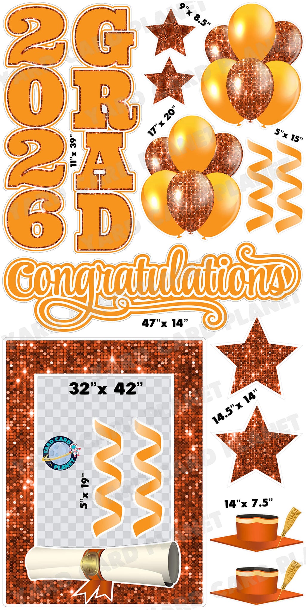 2026 is a huge year for all graduates so why not make it extra special with our amazing Orange Solid and Sequin Pattern 2026 EZ Quick Frame, EZ Quick Sign and Towers Yard Card Flair Set. This set has everything you need to celebrate your hard working graduate this graduation season. Have them pose with their yard card setup behind the EZ Quick Frame making a great memory for them and their family. Add your student's name and other fun graduation flair pieces to make it even more special. You will receive 16 lawn signs, professionally printed, precision cut and ready to stake in various sizes shown below.