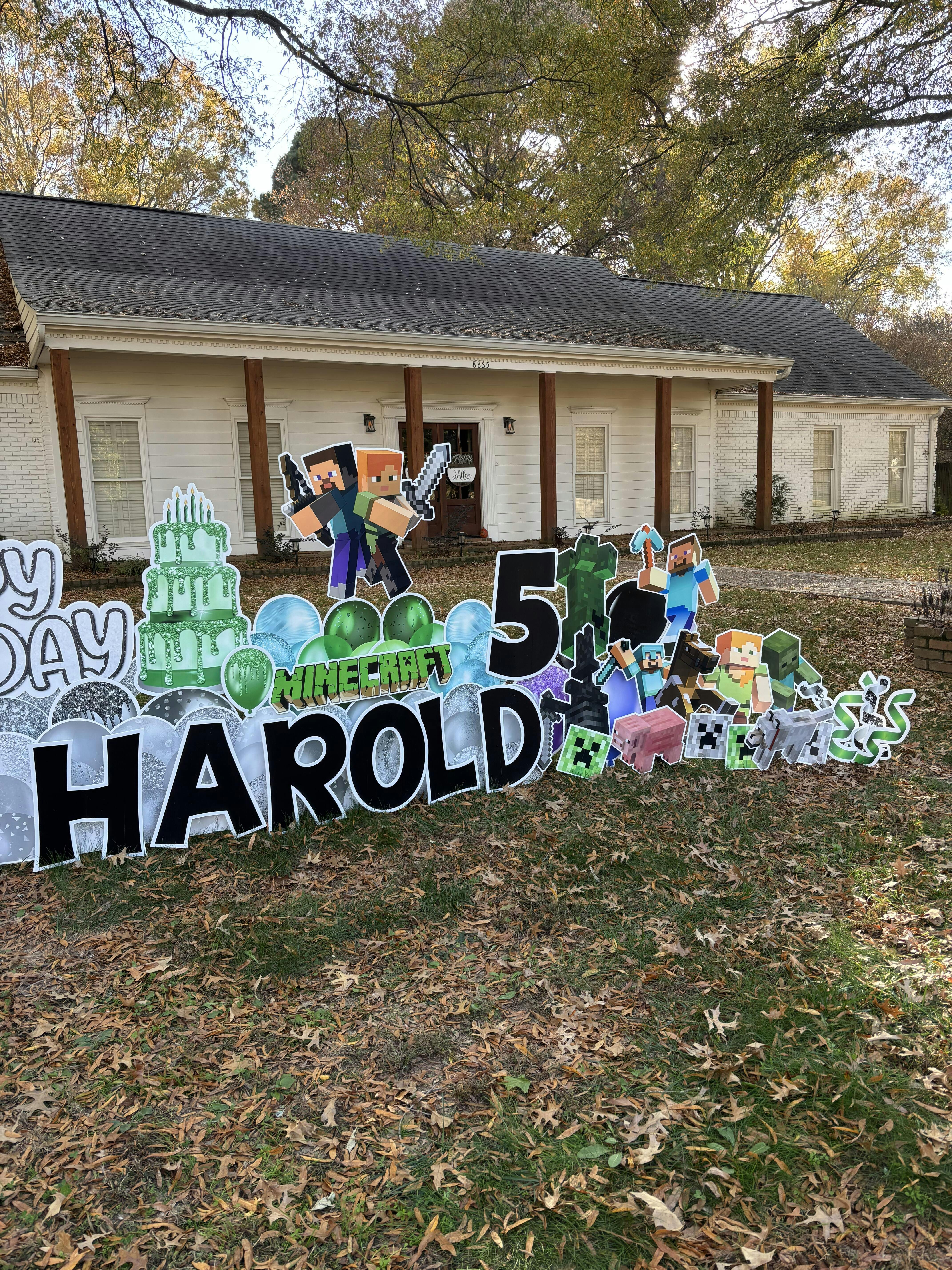 Minecraft is a sensation with kids and they can't get enough of it, spending hours playing. Now you can celebrate any gaming lover with our awesome Pixel Adventure Yard Card Flair Set. This set makes a great addition to any lawn sign display and can easily be customized by adding a greeting, a name and other fun flair pieces as part of the yard card setup. You will receive 14 lawn signs, professionally printed, precision cut and ready to stake in various sizes shown below.