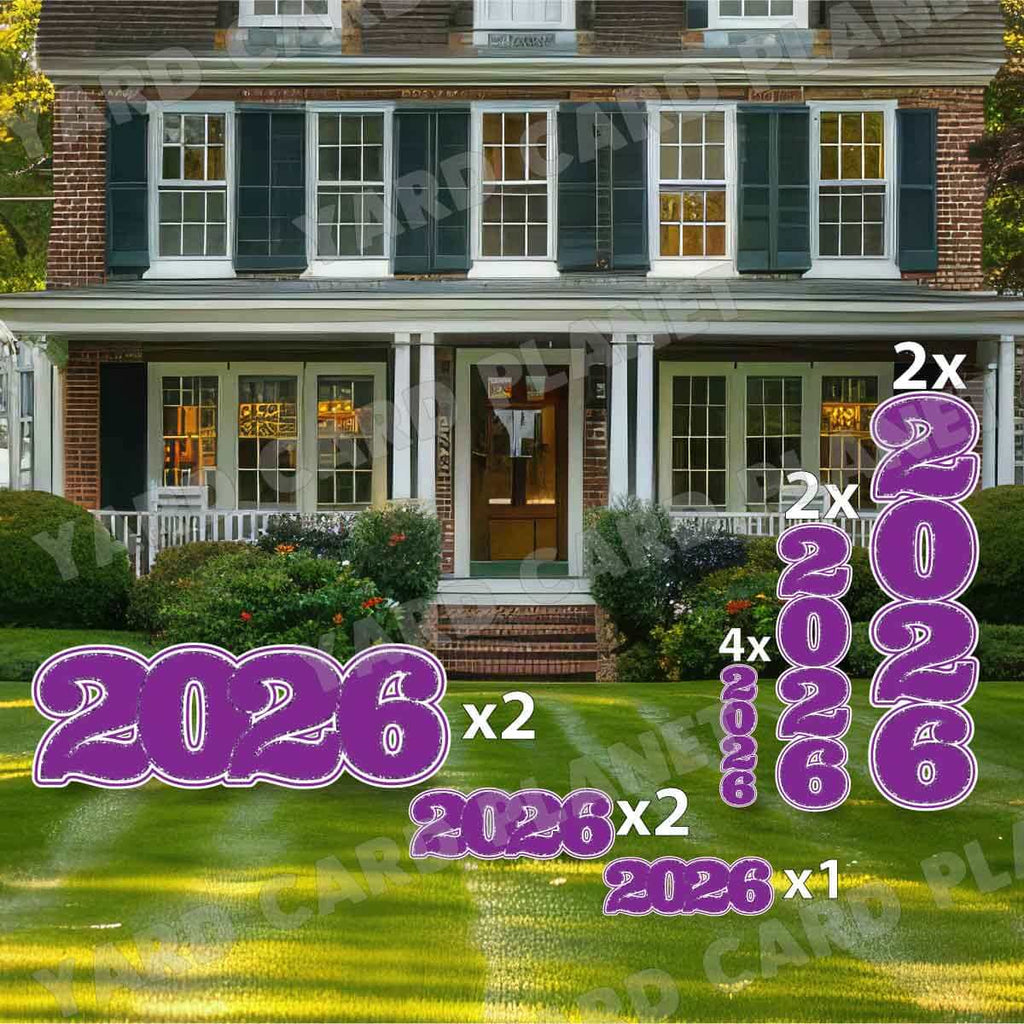 The year 2026 will be a special memory for all graduates this graduation season. Fill up your graduation yard card setups with our awesome Purple Solid with Glitter Pattern Trim 2026 EZ Quick Signs and Towers Yard Card Set. These are great for combining with other fun graduation yard card pieces as well as your student's name in their school colors for your graduation lawn signs display. You will receive 13 lawn signs, professionally printed, precision cut and ready to stake in various sizes shown below.