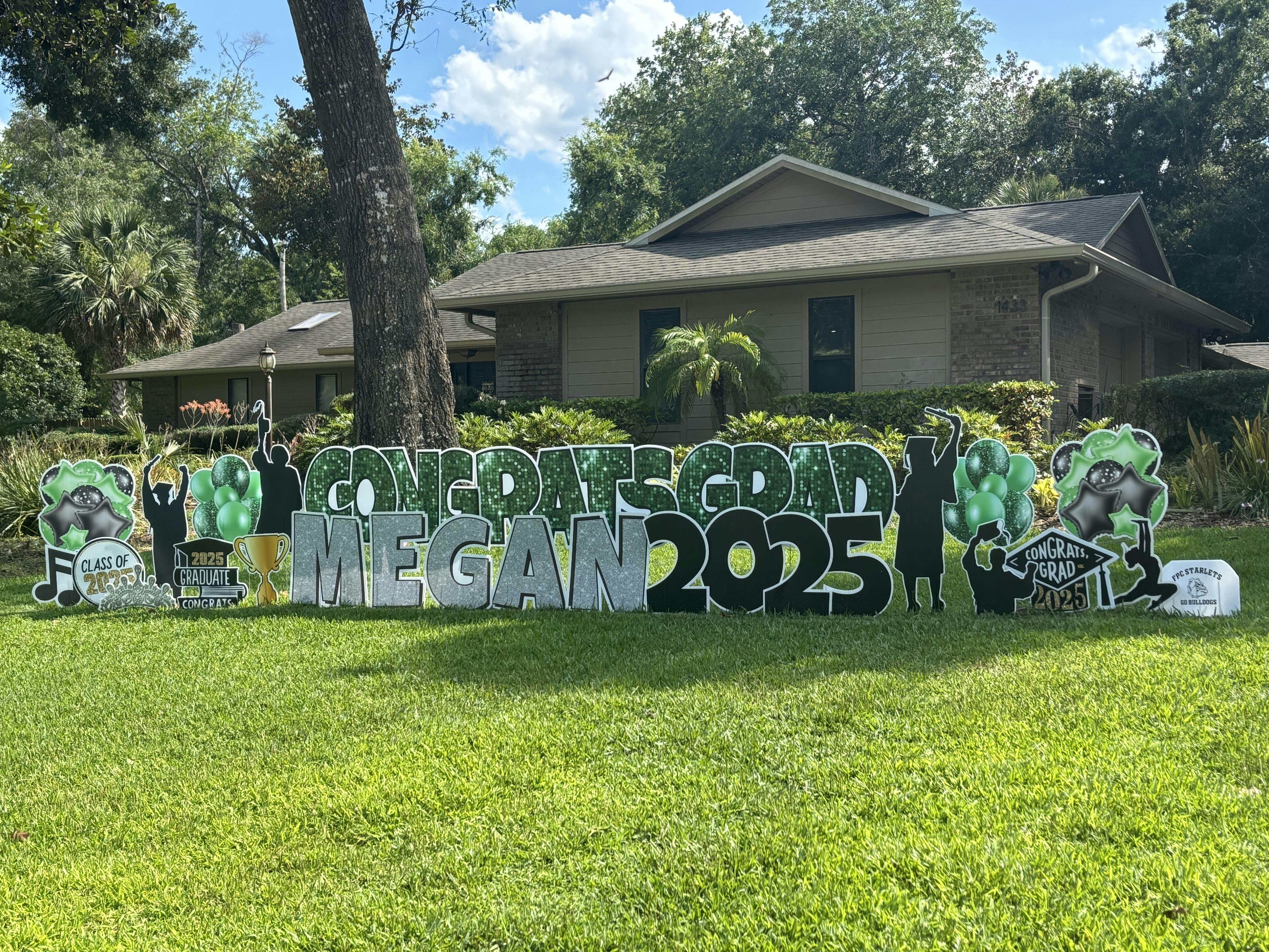 Graduation is an exciting time in student's lives. Years of hard work is now paying off and it's time to celebrate them. Our Silhouette Graduation Yard Card Flair Set is a perfect accent to your graduation yard sign displays and works perfect with all school colors. You will receive 10 lawn signs, professionally printed, precision cut and ready to stake in various sizes shown below.