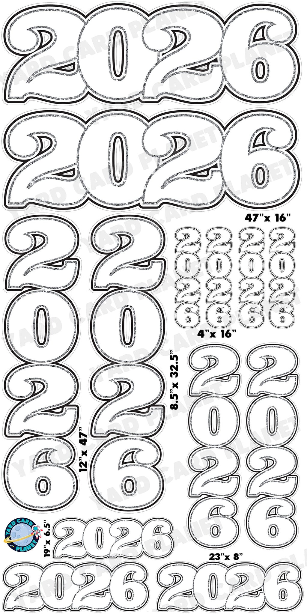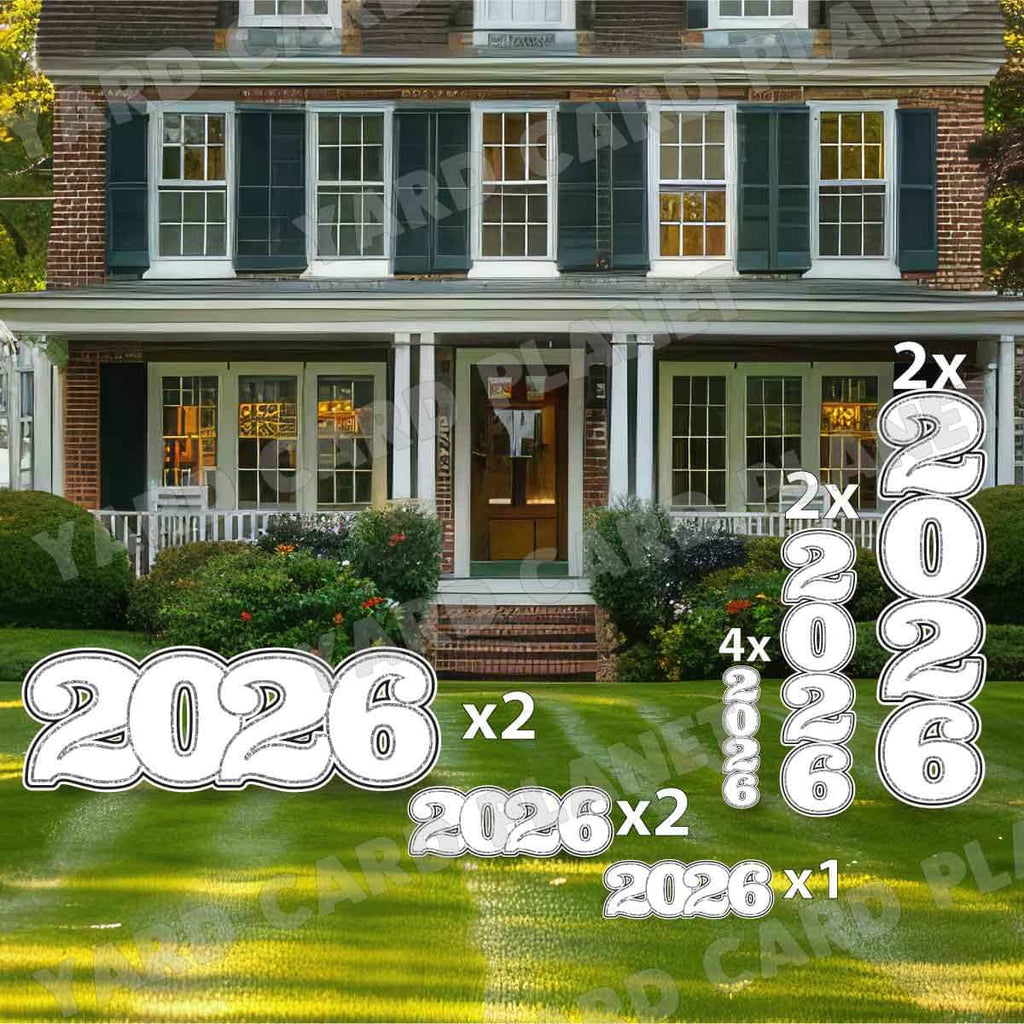 The year 2026 will be a special memory for all graduates this graduation season. Fill up your graduation yard card setups with our awesome White Solid with Glitter Pattern Trim 2026 EZ Quick Signs and Towers Yard Card Set. These are great for combining with other fun graduation yard card pieces as well as your student's name in their school colors for your graduation lawn signs display. You will receive 13 lawn signs, professionally printed, precision cut and ready to stake in various sizes shown below.