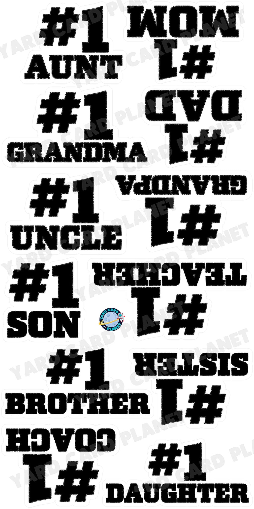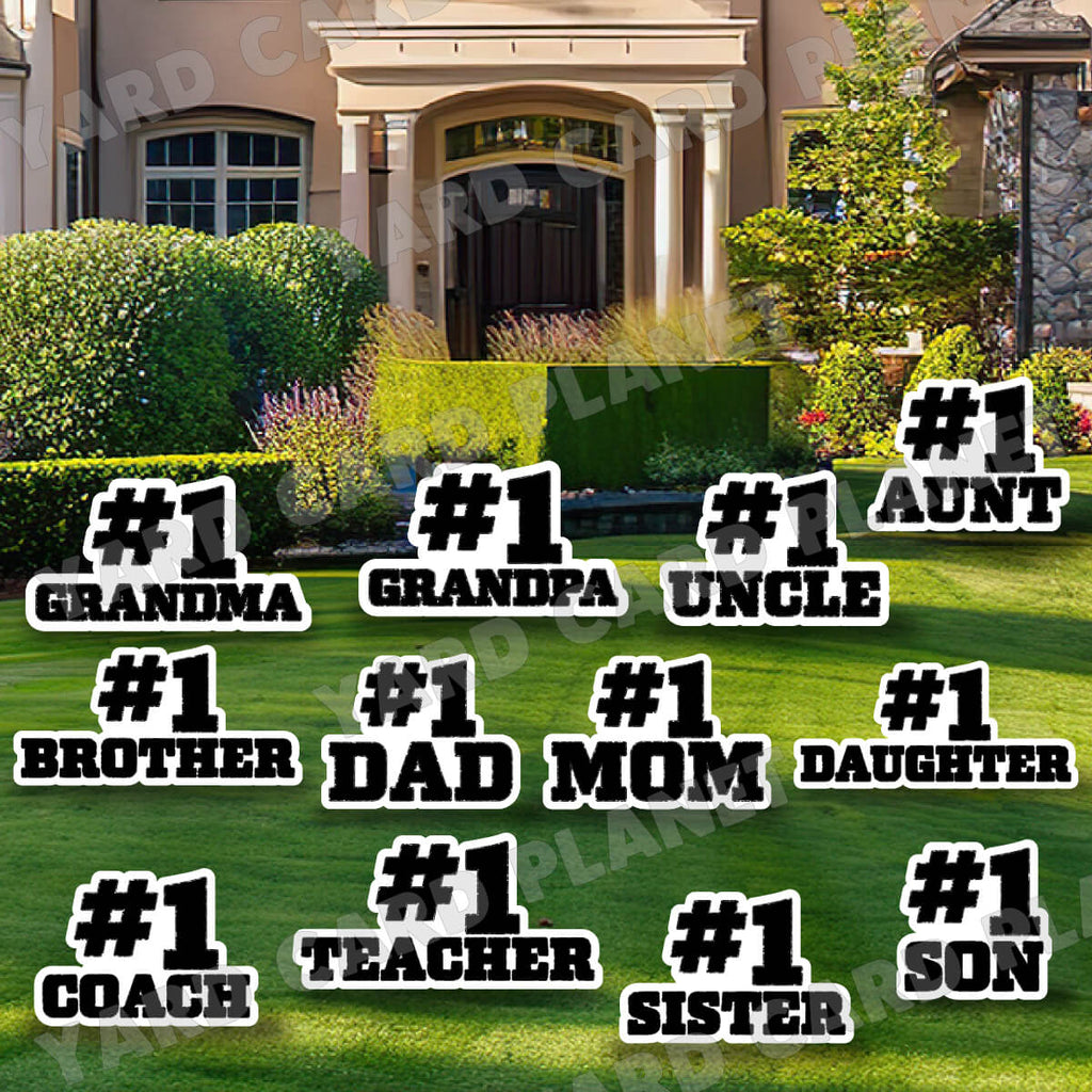 Show everyone who’s number one with our You're #1 EZ Quick Sign Appreciation Yard Card Set. This bold black with black glitter pattern trim set features strong, classic lettering that makes a statement for any occasion. Celebrate your #1 Mom, Dad, Son, Daughter, Brother, Sister, Aunt, Uncle, Grandma, Grandpa, Teacher, and Coach with signs that stand out and deliver instant recognition. This set is perfect for birthdays, graduations, school events, sports celebrations, and family gatherings and can easily be customized by adding a greeting, a name and other fun flair pieces as part of the yard card setup. You will receive 12 lawn signs, professionally printed, precision cut and ready to stake in various sizes shown below.